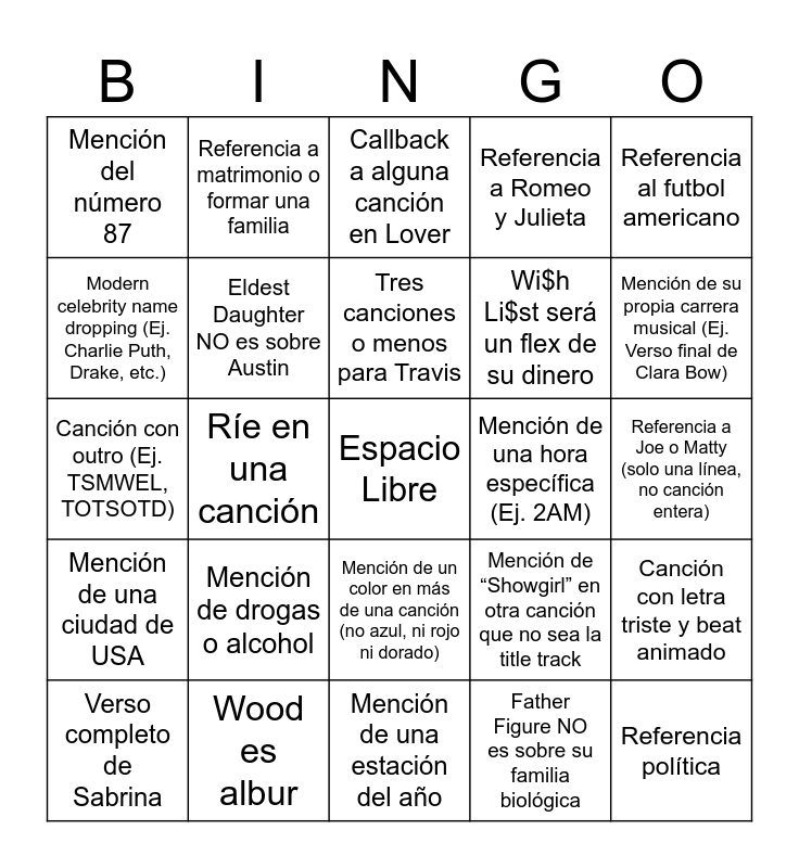 This bingo card has a free space and 24 words: Mención de drogas o alcohol, Wood es albur, Tres canciones o menos para Travis, Verso completo de Sabrina, Referencia al futbol americano, Mención del número 87, Modern celebrity name dropping (Ej. Charlie Puth, Drake, etc.), Referencia a matrimonio o formar una familia, Mención de una hora específica (Ej. 2AM), Mención de un color en más de una canción (no azul, ni rojo ni dorado), Wi$h Li$st será un flex de su dinero, Canción con outro (Ej. TSMWEL, TOTSOTD), Mención de “Showgirl” en otra canción que no sea la title track, Canción con letra triste y beat animado, Eldest Daughter NO es sobre Austin, Father Figure NO es sobre su familia biológica, Referencia a Joe o Matty (solo una línea, no canción entera), Callback a alguna canción en Lover, Mención de su propia carrera musical (Ej. Verso final de Clara Bow), Ríe en una canción, Referencia política, Mención de una ciudad de USA, Referencia a Romeo y Julieta and Mención de una estación del año.