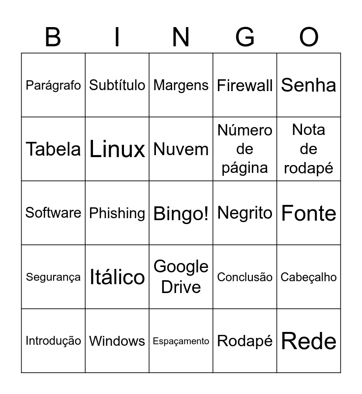 This bingo card has a free space and 40 words: Hardware, Software, Sistema Operacional, Linux, Windows, Google Drive, Nuvem, Backup, Senha, Segurança, Phishing, Firewall, Rede, Fonte, Negrito, Itálico, Sublinhado, Parágrafo, Alinhamento, Margens, Cabeçalho, Rodapé, Número de página, Tabela, Gráfico, Imagem, Colunas, Sombreamento, Citação, Referências, Sumário, Introdução, Desenvolvimento, Conclusão, Nota de rodapé, Espaçamento, Justificado, Título, Subtítulo and Margem padrão.