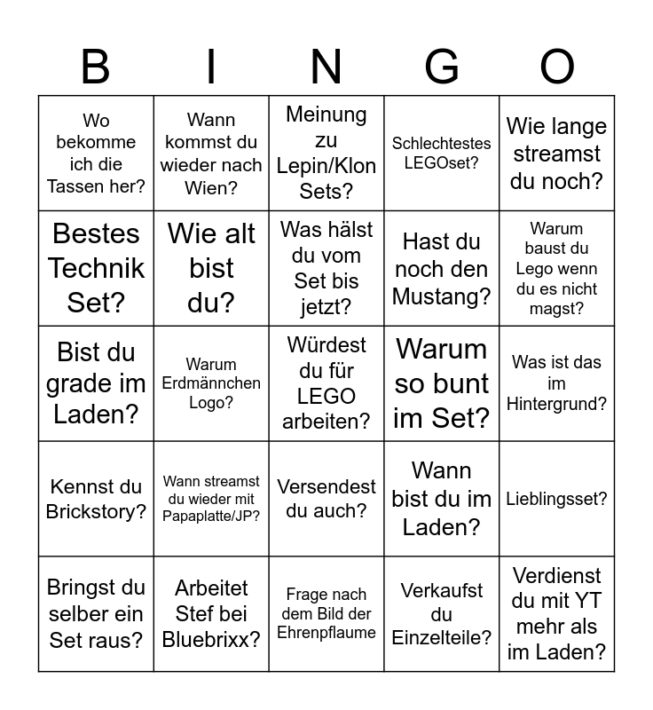This bingo card has 35 words: Kannst du mich grüßen?, Was baust du grade?, Ist Stef deine Schwester?, Wie alt bist du?, Versendest du auch?, Schlechtestes LEGOset?, Bestes Technik Set?, Wer ist das? (Gorilla), Was hälst du vom Set bis jetzt?, Was hälst du von Set XXX (das nicht nicht erschienen ist)?, Bist du grade im Laden?, Wie lange streamst du noch?, Was sind das für Matten?, Trägst du eine Hose?, Wo bekomme ich die Tassen her?, Warum so bunt im Set?, Verkaufst du Einzelteile?, Warum Erdmännchen Logo?, Kennst du Brickstory?, Würdest du für LEGO arbeiten?, Wann bist du im Laden?, Bringst du selber ein Set raus?, Lieblingsset?, Arbeitet Stef bei Bluebrixx?, Meinung zu Lepin/Klon Sets?, Warum baust du Lego wenn du es nicht magst?, Verdienst du mit YT mehr als im Laden?, Wie teuer ist das Set?, Hast du noch den Mustang?, Was ist das im Hintergrund?, Was isst du da?, Frage nach dem Bild der Ehrenpflaume, Wann streamst du wieder mit Papaplatte/JP?, Wann kommst du wieder nach Wien? and Wie groß bist du?.