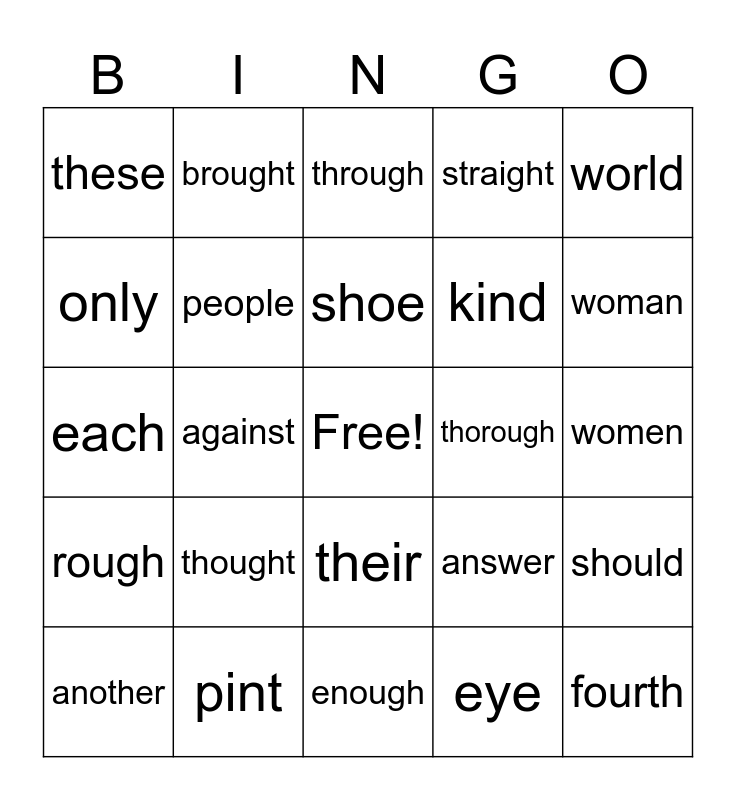 This bingo card has a free space and 24 words: thought, pint, shoe, another, world, these, only, brought, thorough, their, kind, each, answer, should, people, eye, women, through, woman, against, fourth, rough, straight and enough.