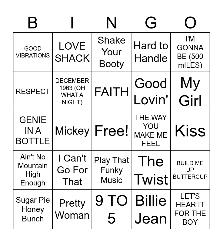 This bingo card has a free space and 50 words: Stayin' Alive, LET'S HEAR IT FOR THE BOY, JUMP, 9 TO 5, I Can't Go For That, YOU CAN'T HURRY LOVE, LOVE SHACK, STOP, RESPECT, VALERIE, DECEMBER 1963 (OH WHAT A NIGHT), Hard to Handle, BUILD ME UP BUTTERCUP, The Twist, GROOVE IS IN THE HEART, WHAT I LIKE ABOUT YOU, FAITH, THE WAY YOU MAKE ME FEEL, IT'S NOT UNUSUAL, I'M GONNA BE (500 mILES), Mickey, Billie Jean, GOOD VIBRATIONS, Good Lovin', GET THE PARTY STARTED, I Can't Get No Satisfaction, My Girl, I Want It That Way, Shake Your Booty, Play That Funky Music, BYE BYE BYE, Ice Ice Baby, Gangsta's Paradise, Tossin' and Turnin', Pretty Woman, Day Tripper, DANCING QUEEN, Man! I Feel Like a Woman, Cupid Shuffle, Kiss, Bad Romance, Hit Me With Your Best Shot, Don't Stop, TIME OF OUR LIVES, Sugar Pie Honey Bunch, GENIE IN A BOTTLE, U CAN'T TOUCH THIS, Signed Sealed Delivered, Ain't No Mountain High Enough and I Gotta Feeling.