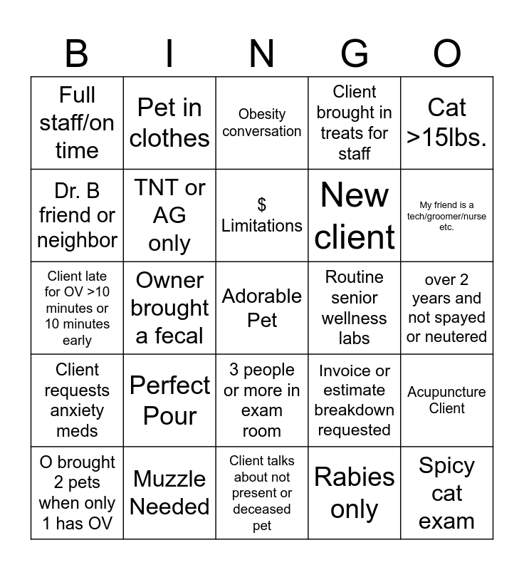 This bingo card has a free space and 24 words: Perfect Pour, Muzzle Needed, $ Limitations, O brought 2 pets when only 1 has OV, Cat >15lbs., Full staff/on time, Dr. B friend or neighbor, Pet in clothes, Routine senior wellness labs, 3 people or more in exam room, New client, Client late for OV >10 minutes or 10 minutes early, Invoice or estimate breakdown requested, Acupuncture Client, TNT or AG only, Rabies only, over 2 years and not spayed or neutered, Obesity conversation, My friend is a tech/groomer/nurse etc., Owner brought a fecal, Spicy cat exam, Client requests anxiety meds, Client brought in treats for staff and Client talks about not present or deceased pet.