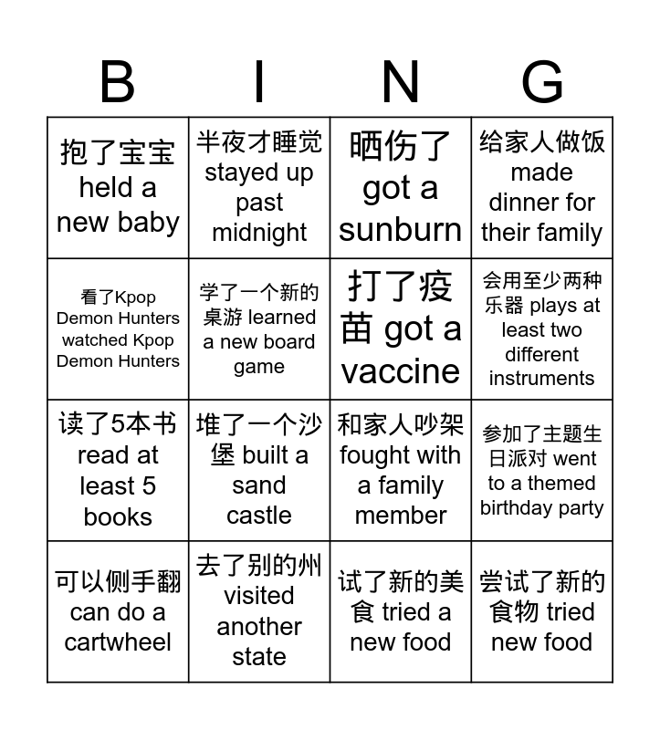This bingo card has 20 words: 参加了主题生日派对 went to a themed birthday party, 闯祸后被抓住 got in trouble and got caught, 晒伤了 got a sunburn, 帮助了陌生人 helped a stranger, 可以侧手翻 can do a cartwheel, 看了Kpop Demon Hunters watched Kpop Demon Hunters, 去了别的州 visited another state, 抱了宝宝 held a new baby, 读了5本书 read at least 5 books, 半夜才睡觉 stayed up past midnight, 堆了一个沙堡 built a sand castle, 和家人吵架 fought with a family member, 学了一个新的桌游 learned a new board game, 尝试了新的食物 tried new food, 打了疫苗 got a vaccine, 用了两个小时做作业 did homework for 2 hours, 会用至少两种乐器 plays at least two different instruments, 给家人做饭 made dinner for their family, 试了新的美食 tried a new food and 买了新的衣服 bought new clothes.