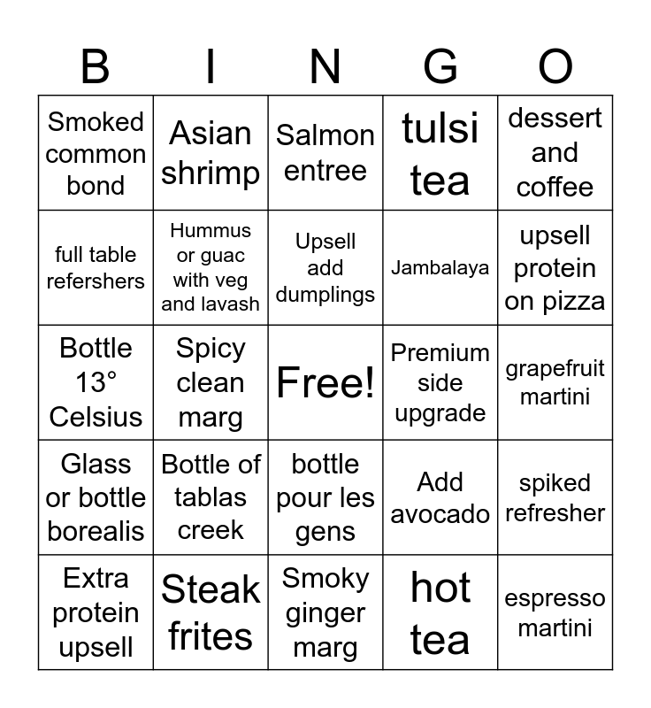 This bingo card has a free space and 24 words: Bottle of tablas creek, Steak frites, Upsell add dumplings, Extra protein upsell, dessert and coffee, Smoked common bond, full table refershers, Asian shrimp, Premium side upgrade, bottle pour les gens, Jambalaya, Bottle 13° Celsius, Add avocado, spiked refresher, Hummus or guac with veg and lavash, hot tea, grapefruit martini, Salmon entree, upsell protein on pizza, Spicy clean marg, espresso martini, Glass or bottle borealis, tulsi tea and Smoky ginger marg.