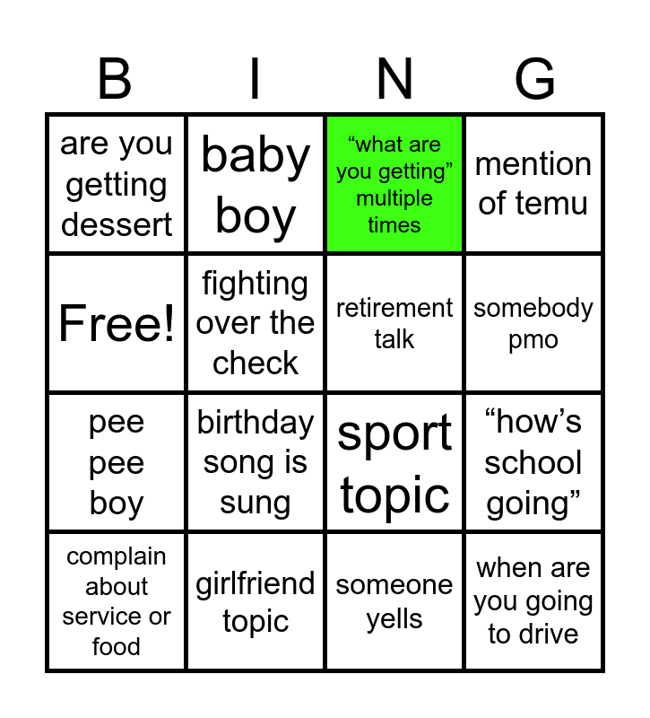 This bingo card has 16 words: girlfriend topic, “how’s school going”, “what are you getting” multiple times, are you getting dessert, pee pee boy, baby boy, sport topic, someone yells, Free!, fighting over the check, complain about service or food, mention of temu, birthday song is sung, somebody pmo, retirement talk and when are you going to drive.