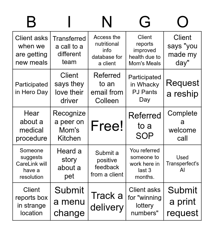 This bingo card has a free space and 29 words: Client reports box in strange location, Had to clear your cookies for MAX, Recognize a peer on Mom's Kitchen, Took a walk during lunch, Client asks when we are getting new meals, Access the nutritional info database for a client, Client says they love their driver, Heard a story about a pet, Referred to a SOP, Submit a menu change, Complete a welcome call, Submit a print request, Track a delivery, Client asks for "winning lottery numbers", Request a reship, Client has same birth month/day as you, Submit a positive feedback from a client, Someone suggests CareLink will have a resolution, Client says "you made my day", Hear about a medical procedure, You referred someone to work here in last 3 months., Participated in Band Tshirt day, Participated in Whacky PJ Pants Day, Participated in Hero Day, Client reports improved health due to Mom's Meals, Transferred a call to a different team, Used Transperfect's AI, Referred to an email from Colleen and Talked about the weather with a client.