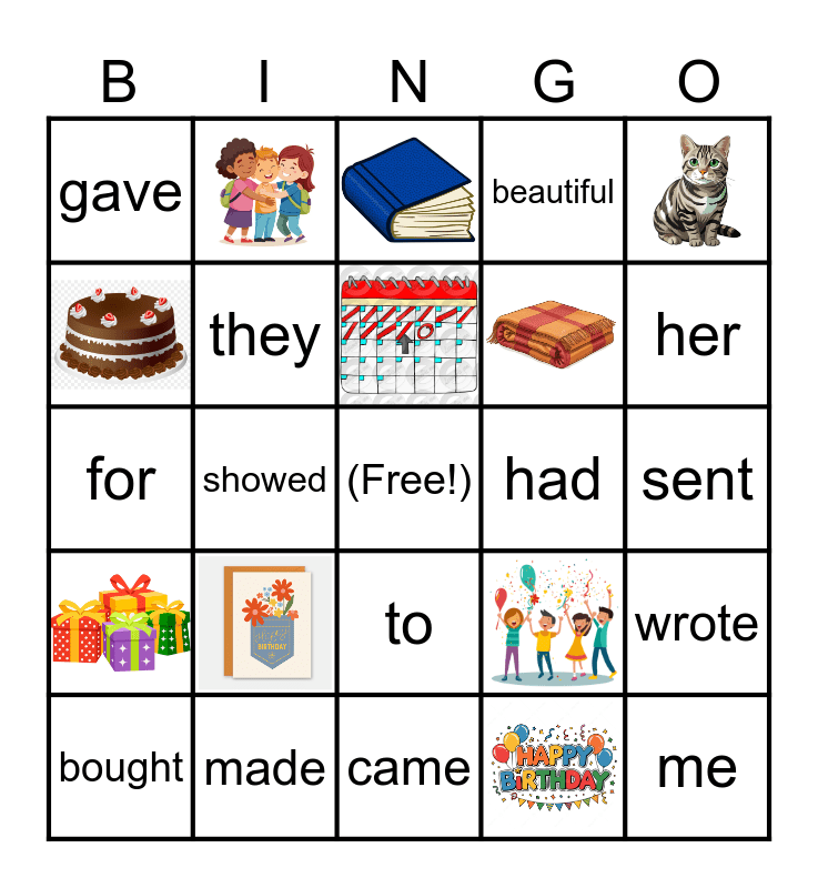 This bingo card has 10 images, a free space and 14 words: made, bought, gave, had, to, for, wrote, they, sent, her, showed, me, beautiful and came.