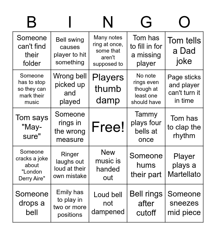 This bingo card has a free space and 29 words: Someone drops a bell, Tom yells "stop stop stop"!, Someone rings in the wrong measure, Mallet goes flying, Someone can't find their folder, Many notes ring at once, some that aren't supposed to, Wrong bell picked up and played, Ringer laughs out loud at their own mistake, Tammy plays four bells at once, Emily has to play in two or more positions, Tom has to clap the rhythm, Someone sneezes mid piece, Loud bell not dampened, Bell rings after cutoff, Page sticks and player can't turn it in time, Tom asks player if they know where they are, New music is handed out, Someone cracks a joke about "London Derry Aire", Tom tells a Dad joke, Tom says "May-sure", Someone hums their part, Someone asks what the order of music is, No note rings even though at least one should have, Someone has to stop so they can mark their music, Tom has to fill in for a missing player, Bell swing causes player to hit something, Player plays a Martellato, Players thumb damp and Tom asks a trivia question.