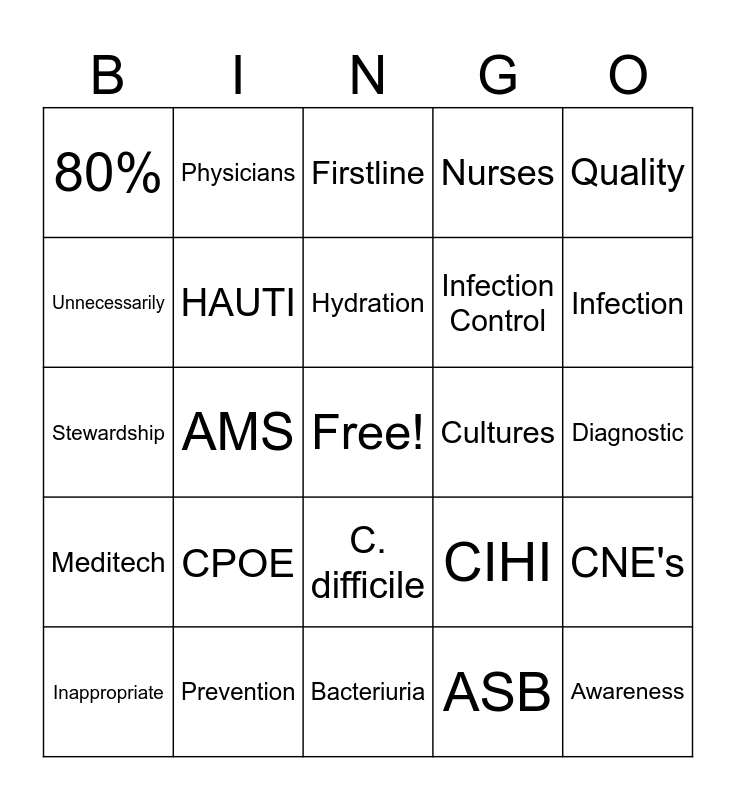 This bingo card has a free space and 29 words: Inappropriate, Clinical Criteria, AMS, Antibiotics, 80%, Firstline, HAUTI, CPOE, Cultures, Prevention, Diagnostic, Awareness, Bacteriuria, ASB, Infection, Urine, C. difficile, Meditech, Quality, Stewardship, CIHI, Symptom-based, Infection Control, Unnecessarily, Nurses, Physicians, CNE's, Hydration and Collection.