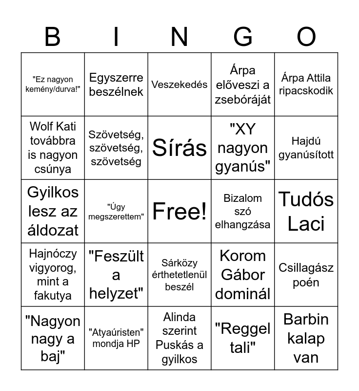 This bingo card has a free space and 24 words: "Nagyon nagy a baj", "Feszült a helyzet", Sírás, "Reggel tali", Árpa Attila ripacskodik, "Ez nagyon kemény/durva!", Egyszerre beszélnek, Veszekedés, Bizalom szó elhangzása, Tudós Laci, Gyilkos lesz az áldozat, Szövetség, szövetség, szövetség, Korom Gábor dominál, Csillagász poén, Wolf Kati továbbra is nagyon csúnya, "Atyaúristen" mondja HP, Alinda szerint Puskás a gyilkos, Árpa előveszi a zsebóráját, Hajdú gyanúsított, Hajnóczy vigyorog, mint a fakutya, "Úgy megszerettem", Sárközy érthetetlenül beszél, "XY nagyon gyanús" and Barbin kalap van.