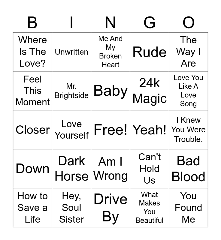 This bingo card has a free space and 54 words: Airplanes, Down, Watcha Say, Fireflies, Am I Wrong, Good Feeling, Rude, Timber, Feel This Moment, Counting Stars, Where Is The Love?, Tik Tok, Hey, Soul Sister, How to Save a Life, Hey There Delilah, Drive By, You Found Me, 24k Magic, The Man Who Can't Be Moved, I Knew You Were Trouble., Can't Hold Us, Maps, Yeah!, The Way I Are, Pocketful of Sunshine, Unwritten, I Want It That Way, Girl on Fire, Diamonds, What Makes You Beautiful, Bad Romance, Oops!...I Did It Again, Toxic, A Thousand Miles, Me And My Broken Heart, Kiss Me Thru The Phone, Closer, Bad Blood, Boyfriend, Mr. Brightside, Teenage Dream, Stereo Hearts, Replay, Nothin' on You, Dark Horse, This Love, Get Lucky, Ms. Jackson, Baby, Love Yourself, Love You Like A Love Song, Shake It Off, Black and Yellow and Pumped Up Kicks.
