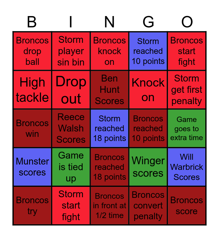 This bingo card has a free space and 44 words: Storm Score, Broncos score, Melbourne try, Broncos try, Storm convert penalty, Broncos convert penalty, Broncos knock on, Storm knock on, Broncos start fight, Storm start fight, Storm reached 10 points, Broncos reached 10 points, Broncos reached 18 points, Game is tied up, Storm in front at 1/2 time, Broncos in front at 1/2 time, Storm win, Broncos win, Broncos get first penalty, Storm get first penalty, Storm player sin bin, Broncos player sin bin, Storm drop ball, Broncos drop ball, Ref falls over, Game goes to extra time, Broncos get 40/20, Storm get 40/20, Winger scores, Munster scores, Jahrome Hughes scores, Will Warbrick Scores, Jack Howarth scores, Xavier Coates Scores, Reece Walsh Scores, Joshua Karpanin scores, Adam Reynolds Scores, Deine Mariner scores, Ben Hunt Scores, High tackle, Knock on, Taken into touch, Drop out and Penalty Try.