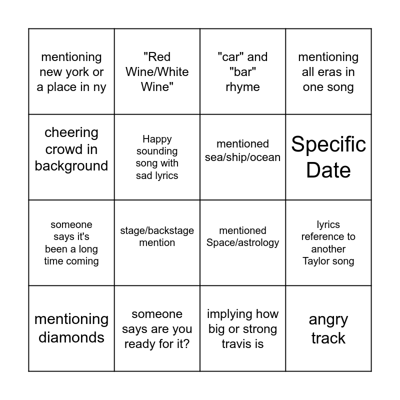 This bingo card has 16 words: someone says are you ready for it?, lyrics reference to another Taylor song, "car" and "bar" rhyme, mentioning new york or a place in ny, someone says it's been a long time coming, "Red Wine/White Wine", mentioned Space/astrology, implying how big or strong travis is, cheering crowd in background, Happy sounding song with sad lyrics, mentioning diamonds, mentioning all eras in one song, stage/backstage mention, Specific Date, mentioned sea/ship/ocean and angry track.