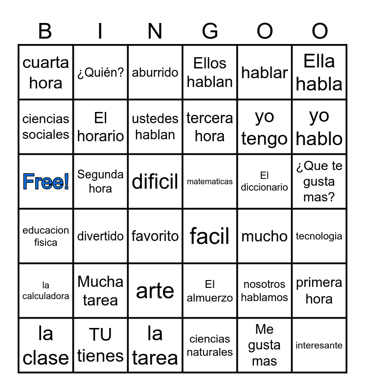 This bingo card has 36 words: El almuerzo, arte, ciencias naturales, ciencias sociales, educacion fisica, matematicas, El horario, la tarea, hablar, nosotros hablamos, yo hablo, Ellos hablan, primera hora, Segunda hora, tercera hora, cuarta hora, la calculadora, El diccionario, Free!, aburrido, dificil, divertido, facil, favorito, mucho, ¿Quién?, yo tengo, TU tienes, ustedes hablan, Ella habla, interesante, la clase, tecnologia, ¿Que te gusta mas?, Mucha tarea and Me gusta mas.