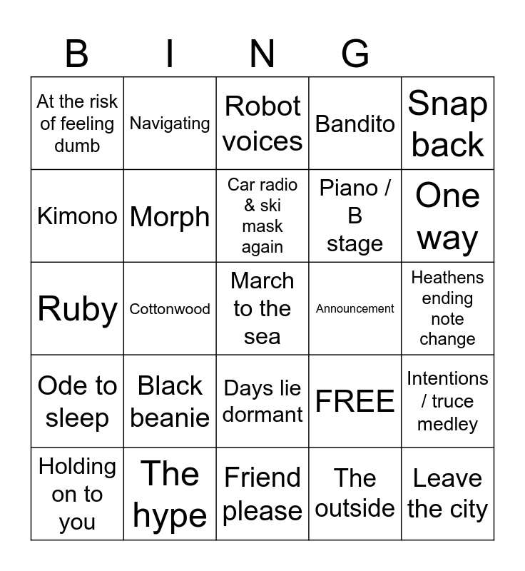 This bingo card has 25 words: Black beanie, Friend please, Car radio & ski mask again, Holding on to you, Snap back, At the risk of feeling dumb, Kimono, Navigating, Announcement, Days lie dormant, Piano / B stage, Ruby, FREE, Intentions / truce medley, Morph, Leave the city, Heathens ending note change, Robot voices, One way, Cottonwood, March to the sea, The hype, Ode to sleep, Bandito and The outside.