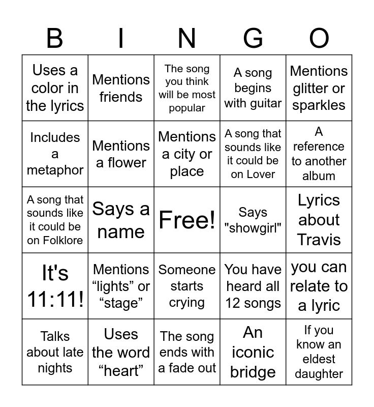 This bingo card has a free space and 24 words: Mentions “lights” or “stage”, Uses the word “heart”, Mentions a city or place, Talks about late nights, Mentions glitter or sparkles, Uses a color in the lyrics, Includes a metaphor, Mentions friends, Says "showgirl", Someone starts crying, A song that sounds like it could be on Lover, A song that sounds like it could be on Folklore, You have heard all 12 songs, you can relate to a lyric, Mentions a flower, An iconic bridge, Lyrics about Travis, The song you think will be most popular, A reference to another album, Says a name, If you know an eldest daughter, It's 11:11!, A song begins with guitar and The song ends with a fade out.