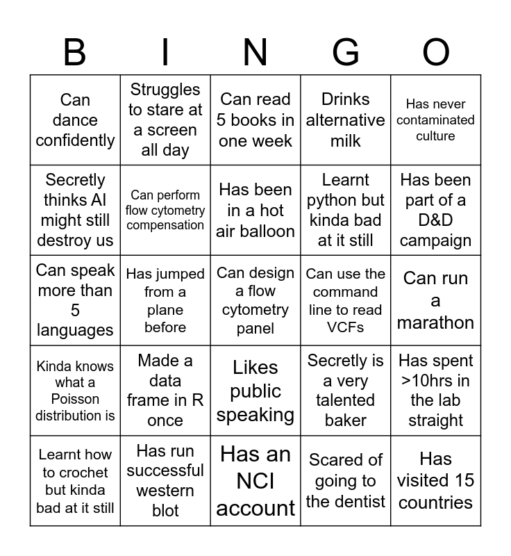 This bingo card has a free space and 24 words: Made a data frame in R once, Has run successful western blot, Has been in a hot air balloon, Learnt how to crochet but kinda bad at it still, Has never contaminated culture, Can dance confidently, Secretly thinks AI might still destroy us, Struggles to stare at a screen all day, Can use the command line to read VCFs, Likes public speaking, Learnt python but kinda bad at it still, Can speak more than 5 languages, Secretly is a very talented baker, Has spent >10hrs in the lab straight, Can perform flow cytometry compensation, Scared of going to the dentist, Can run a marathon, Can read 5 books in one week, Has been part of a D&D campaign, Has jumped from a plane before, Has visited 15 countries, Kinda knows what a Poisson distribution is, Drinks alternative milk and Has an NCI account.
