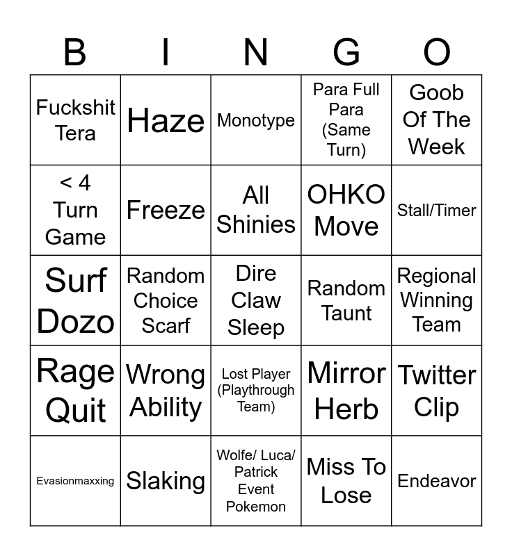 This bingo card has a free space and 39 words: Invisible Focus Sash, Random Covert Cloak, Random Focus Sash, Freeze, Evasionmaxxing, Lost Player (Playthrough Team), All Shinies, Pledges, Goob Of The Week, Rage Quit, Random Choice Scarf, Para Full Para (Same Turn), Endeavor, Regional Winning Team, Random Taunt, Wrong Ability, Self Target, Fuckshit Tera, Dual Weather, Mirror Herb, < 4 Turn Game, Wolfe/ Luca/ Patrick Event Pokemon, OHKO Move, Stall/Timer, Perish Trap, OHKO Through Sash, Flinchmaxxing, Weakness Policy, Less Than 6 Mons, Haze, Eject Button/Pack, Trick, Monotype, Slaking, Miss To Lose, No Pokemon When Game Finishes, Twitter Clip, Surf Dozo and Reverse TR.