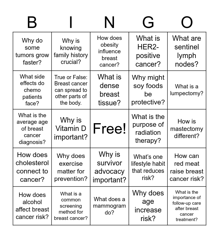 This bingo card has a free space and 25 words: How does alcohol affect breast cancer risk?, Why does exercise matter for prevention?, What is dense breast tissue?, Why does age increase risk?, What is a lumpectomy?, Why do some tumors grow faster?, Why is knowing family history crucial?, How does obesity influence breast cancer?, Why might soy foods be protective?, How can red meat raise breast cancer risk?, What is the average age of breast cancer diagnosis?, True or False: Breast cancer can spread to other parts of the body., What’s one lifestyle habit that reduces risk?, What is the importance of follow-up care after breast cancer treatment?, What side effects do chemo patients face?, What is a common screening method for breast cancer?, What does a mammogram do?, What is HER2-positive cancer?, How is mastectomy different?, How does cholesterol connect to cancer?, Why is Vitamin D important?, Why is survivor advocacy important?, What is the purpose of radiation therapy?, What are sentinel lymph nodes? and What’s one lifestyle habit that reduces risk?.