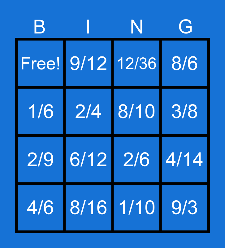 This bingo card has 16 words: 4/6, 8/16, 12/36, 8/6, 1/6, 9/12, 2/6, 4/14, Free!, 2/4, 1/10, 3/8, 2/9, 6/12, 8/10 and 9/3.