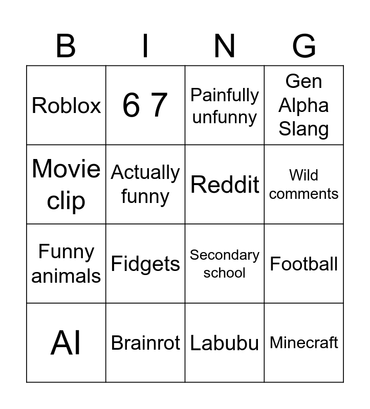 This bingo card has 16 words: Brainrot, Football, Painfully unfunny, Roblox, Funny animals, 6 7, Secondary school, Labubu, Movie clip, Actually funny, AI, Gen Alpha Slang, Fidgets, Wild comments, Reddit and Minecraft.