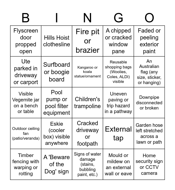 This bingo card has 25 words: Eskie (cooler box) visible anywhere, Signs of water damage (stains, bubbling paint, etc.), Kangaroo or koala statue/ornament, Timber fencing with warping or rotting, Faded or peeling exterior paint, Flyscreen door propped open, Ute parked in driveway or carport, Hills Hoist clothesline, Uneven paving or trip hazard in a pathway, Cracked driveway or footpath, Reusable shopping bags (Woolies, Coles, ALDI) visible, Visible Vegemite jar on a bench or table, External tap, Garden hose left stretched across a lawn or path, Surfboard or boogie board, Home security sign or CCTV camera, Downpipe disconnected or broken, Fire pit or brazier, An Australian flag (any size, sticker, or hanging), Pool pump or pool filter equipment, Children's trampoline, A 'Beware of the Dog' sign, Outdoor ceiling fan (patio/veranda), A chipped or cracked window pane and Mould or mildew on an external wall or eave.