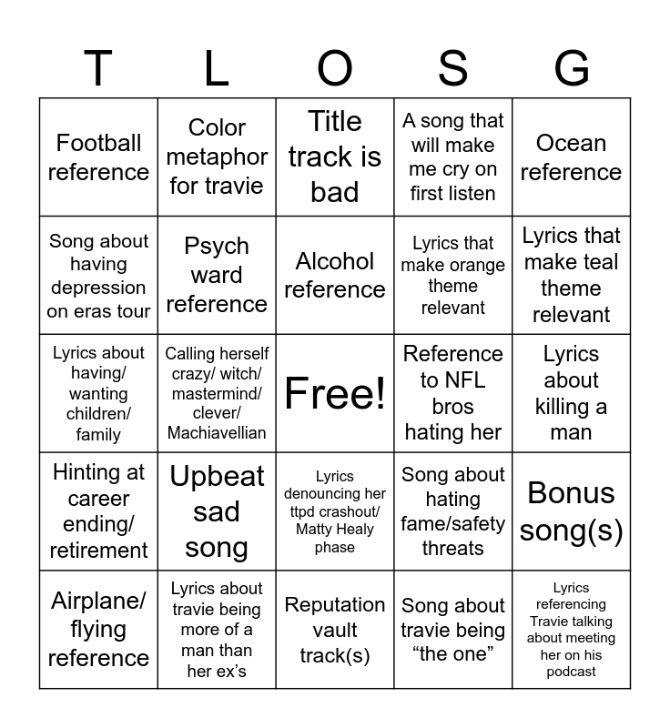 This bingo card has a free space and 24 words: Upbeat sad song, Lyrics about travie being more of a man than her ex’s, Alcohol reference, Airplane/ flying reference, Ocean reference, Football reference, Song about having depression on eras tour, Color metaphor for travie, Reference to NFL bros hating her, Lyrics denouncing her ttpd crashout/ Matty Healy phase, Lyrics that make orange theme relevant, Lyrics about having/ wanting children/ family, Song about hating fame/safety threats, Bonus song(s), Psych ward reference, Song about travie being “the one”, Lyrics about killing a man, Title track is bad, Lyrics that make teal theme relevant, Calling herself crazy/ witch/ mastermind/ clever/ Machiavellian, Lyrics referencing Travie talking about meeting her on his podcast, Hinting at career ending/ retirement, A song that will make me cry on first listen and Reputation vault track(s).