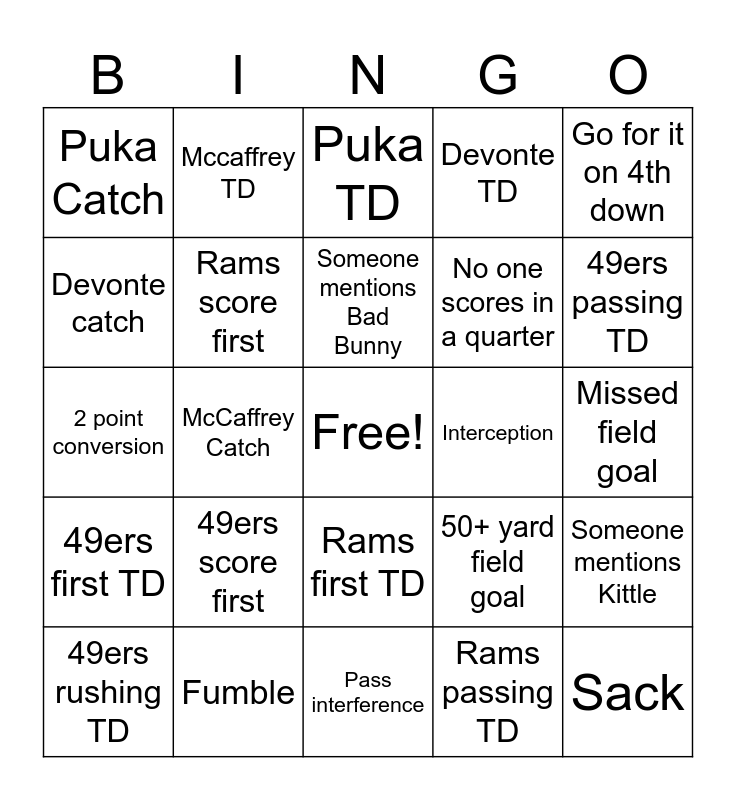 This bingo card has a free space and 29 words: 49ers rushing TD, Rams rushing TD, McCaffrey Catch, McCaffrey 100 + yards, Puka Catch, Puka TD, Rams score first, 49ers score first, Interception, Fumble, Missed field goal, Sack, Pass interference, Rams passing TD, 49ers passing TD, Injury timeout, Rams first TD, 49ers first TD, Go for it on 4th down, 2 point conversion, 50+ yard field goal, Pick 6, No one scores in a quarter, Devonte catch, Devonte TD, Mccaffrey TD, Someone mentions Kittle, Someone mentions Bad Bunny and offsides.