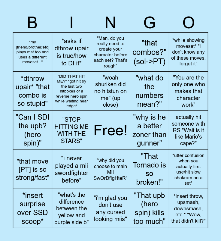 This bingo card has a free space and 24 words: "i never played a mii swordfighter before", "what's the difference between the yellow and purple side b", "woah shuriken did no hitstun on me" (up close), *insert surprise over SSD scoop*, *while showing moveset* "i don't know any of these moves, forget it", "my [friend/brother/etc] plays msf too and uses a different moveset...", *dthrow upair* "that combo is so stupid", *asks if dthrow upair is true/how to DI it*, "why is he a better zoner than gunner", "why did you choose to main MII SwOrDfIgHteR", "what do the numbers mean?", "Can I SDI the upb? (hero spin)", "That Tornado is so broken!", *utter confusion when you actually first use/hit slow chakram on a set*, "DID THAT HIT ME?" *got hit by the last two hitboxes of a reverse hero spin while waiting near ledge*, "That upb (hero spin) kills too much", actually hit someone with RS "Wait is it like Mario's cape?", "Man, do you really need to create your character before each set? That's rough", "You are the only one who makes that character work", "STOP HITTING ME WITH THE STARS", *insert throw, upsmash, downsmash, etc * "Wow, that didn't kill?", "that move [PT] is so strong/fast", "that combos?" (sol->PT) and "i'm glad you don't use any cursed looking miis".