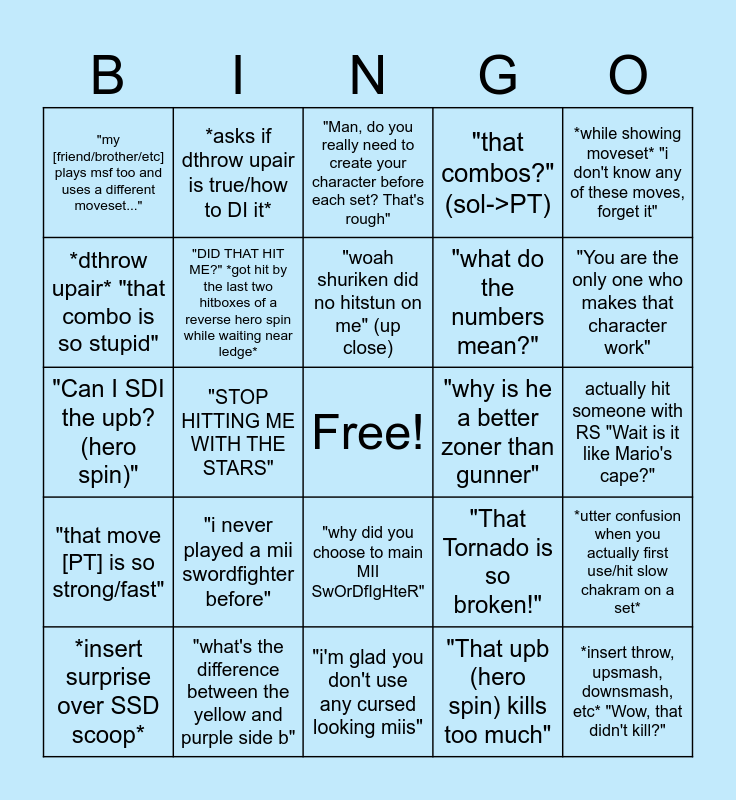 This bingo card has a free space and 24 words: "i never played a mii swordfighter before", "what's the difference between the yellow and purple side b", "woah shuriken did no hitstun on me" (up close), *insert surprise over SSD scoop*, *while showing moveset* "i don't know any of these moves, forget it", "my [friend/brother/etc] plays msf too and uses a different moveset...", *dthrow upair* "that combo is so stupid", *asks if dthrow upair is true/how to DI it*, "why is he a better zoner than gunner", "why did you choose to main MII SwOrDfIgHteR", "what do the numbers mean?", "Can I SDI the upb? (hero spin)", "That Tornado is so broken!", *utter confusion when you actually first use/hit slow chakram on a set*, "DID THAT HIT ME?" *got hit by the last two hitboxes of a reverse hero spin while waiting near ledge*, "That upb (hero spin) kills too much", actually hit someone with RS "Wait is it like Mario's cape?", "Man, do you really need to create your character before each set? That's rough", "You are the only one who makes that character work", "STOP HITTING ME WITH THE STARS", *insert throw, upsmash, downsmash, etc* "Wow, that didn't kill?", "that move [PT] is so strong/fast", "that combos?" (sol->PT) and "i'm glad you don't use any cursed looking miis".