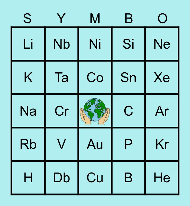 This bingo card has a free space and 24 words: H, V, Co, B, Ne, Li, Nb, Ni, C, Ar, Na, Ta, P, Kr, K, Db, Cu, Si, Xe, Rb, Cr, Au, Sn and He.