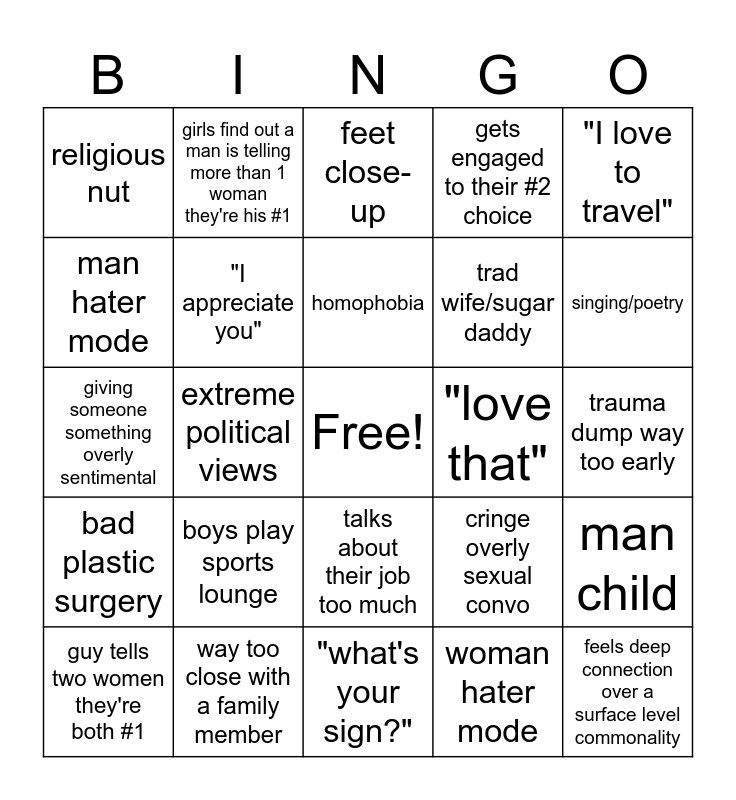 This bingo card has a free space and 24 words: guy tells two women they're both #1, boys play sports lounge, homophobia, woman hater mode, "I love to travel", religious nut, girls find out a man is telling more than 1 woman they're his #1, feet close-up, "love that", trauma dump way too early, giving someone something overly sentimental, "I appreciate you", cringe overly sexual convo, man child, man hater mode, way too close with a family member, "what's your sign?", gets engaged to their #2 choice, singing/poetry, bad plastic surgery, extreme political views, talks about their job too much, trad wife/sugar daddy and feels deep connection over a surface level commonality.