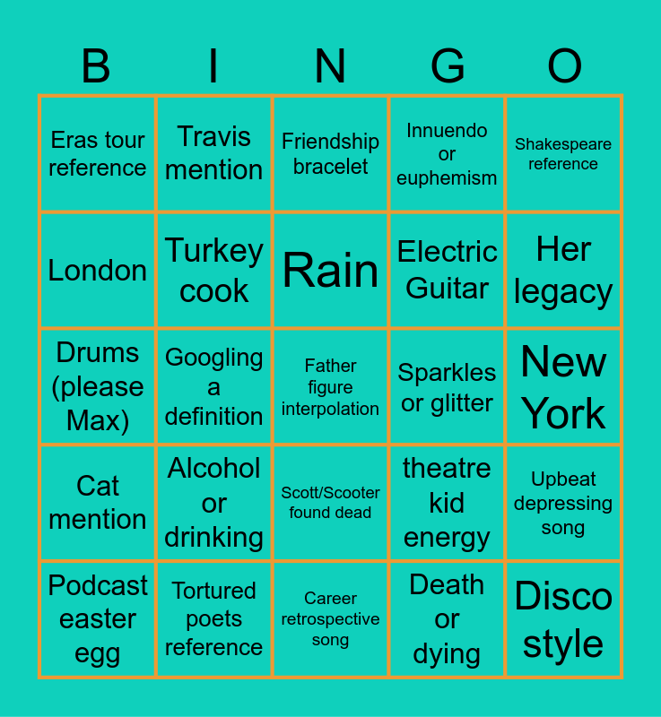 This bingo card has a free space and 24 words: Alcohol or drinking, Tortured poets reference, Rain, Podcast easter egg, Shakespeare reference, Eras tour reference, London, Travis mention, Sparkles or glitter, Scott/Scooter found dead, Electric Guitar, Drums (please Max), theatre kid energy, Upbeat depressing song, Turkey cook, Death or dying, New York, Friendship bracelet, Her legacy, Googling a definition, Disco style, Cat mention, Innuendo or euphemism and Career retrospective song.