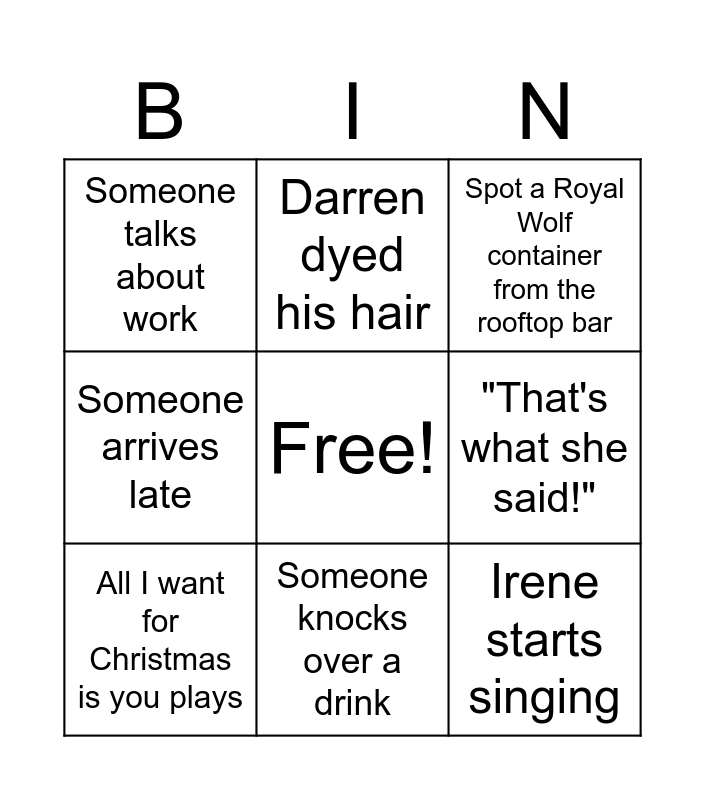 This bingo card has a free space and 11 words: Elijah tells a NSFW joke/story, Someone knocks over a drink, Irene starts singing, All I want for Christmas is you plays, Darren dyed his hair, Spot a Royal Wolf container from the rooftop bar, "That's what she said!", Awkward Silence, Someone arrives late, Someone talks about work and A partner shows up anyway.