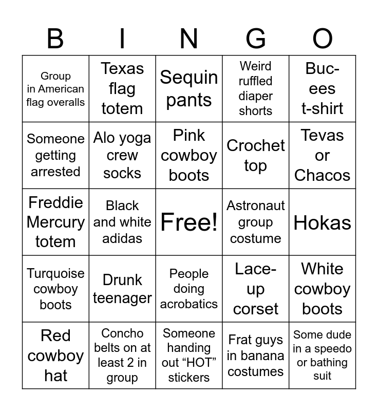 This bingo card has a free space and 24 words: Drunk teenager, Concho belts on at least 2 in group, Pink cowboy boots, Red cowboy hat, Buc-ees t-shirt, Group in American flag overalls, Someone getting arrested, Texas flag totem, Astronaut group costume, People doing acrobatics, Crochet top, Freddie Mercury totem, Lace-up corset, White cowboy boots, Alo yoga crew socks, Frat guys in banana costumes, Hokas, Sequin pants, Tevas or Chacos, Black and white adidas, Some dude in a speedo or bathing suit, Turquoise cowboy boots, Weird ruffled diaper shorts and Someone handing out “HOT” stickers.