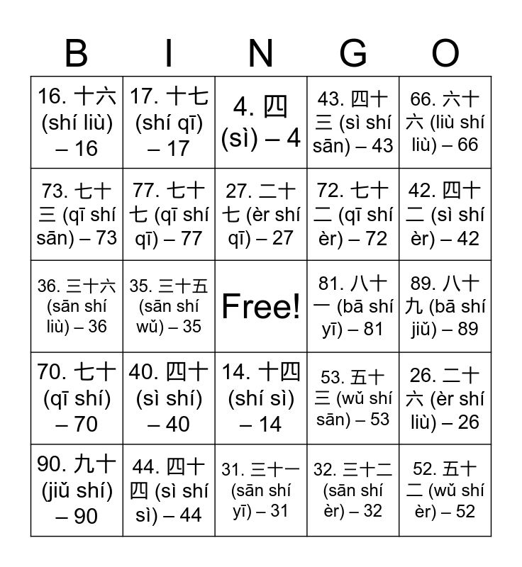 This bingo card has a free space and 99 words: 1. 一 (yī) – 1, 2. 二 (èr) – 2, 3. 三 (sān) – 3, 4. 四 (sì) – 4, 5. 五 (wǔ) – 5, 6. 六 (liù) – 6, 7. 七 (qī) – 7, 8. 八 (bā) – 8, 9. 九 (jiǔ) – 9, 10. 十 (shí) – 10, 11. 十一 (shí yī) – 11, 12. 十二 (shí èr) – 12, 13. 十三 (shí sān) – 13, 14. 十四 (shí sì) – 14, 15. 十五 (shí wǔ) – 15, 16. 十六 (shí liù) – 16, 17. 十七 (shí qī) – 17, 18. 十八 (shí bā) – 18, 19. 十九 (shí jiǔ) – 19, 20. 二十 (èr shí) – 20, 21. 二十一 (èr shí yī) – 21, 22. 二十二 (èr shí èr) – 22, 23. 二十三 (èr shí sān) – 23, 24. 二十四 (èr shí sì) – 24, 25. 二十五 (èr shí wǔ) – 25, 26. 二十六 (èr shí liù) – 26, 27. 二十七 (èr shí qī) – 27, 28. 二十八 (èr shí bā) – 28, 29. 二十九 (èr shí jiǔ) – 29, 30. 三十 (sān shí) – 30, 31. 三十一 (sān shí yī) – 31, 32. 三十二 (sān shí èr) – 32, 33. 三十三 (sān shí sān) – 33, 34. 三十四 (sān shí sì) – 34, 35. 三十五 (sān shí wǔ) – 35, 36. 三十六 (sān shí liù) – 36, 37. 三十七 (sān shí qī) – 37, 38. 三十八 (sān shí bā) – 38, 39. 三十九 (sān shí jiǔ) – 39, 40. 四十 (sì shí) – 40, 41. 四十一 (sì shí yī) – 41, 42. 四十二 (sì shí èr) – 42, 43. 四十三 (sì shí sān) – 43, 44. 四十四 (sì shí sì) – 44, 45. 四十五 (sì shí wǔ) – 45, 46. 四十六 (sì shí liù) – 46, 47. 四十七 (sì shí qī) – 47, 48. 四十八 (sì shí bā) – 48, 49. 四十九 (sì shí jiǔ) – 49, 50. 五十 (wǔ shí) – 50, 51. 五十一 (wǔ shí yī) – 51, 52. 五十二 (wǔ shí èr) – 52, 53. 五十三 (wǔ shí sān) – 53, 54. 五十四 (wǔ shí sì) – 54, 55. 五十五 (wǔ shí wǔ) – 55, 56. 五十六 (wǔ shí liù) – 56, 57. 五十七 (wǔ shí qī) – 57, 58. 五十八 (wǔ shí bā) – 58, 59. 五十九 (wǔ shí jiǔ) – 59, 60. 六十 (liù shí) – 60, 61. 六十一 (liù shí yī) – 61, 62. 六十二 (liù shí èr) – 62, 63. 六十三 (liù shí sān) – 63, 64. 六十四 (liù shí sì) – 64, 65. 六十五 (liù shí wǔ) – 65, 66. 六十六 (liù shí liù) – 66, 67. 六十七 (liù shí qī) – 67, 68. 六十八 (liù shí bā) – 68, 69. 六十九 (liù shí jiǔ) – 69, 70. 七十 (qī shí) – 70, 71. 七十一 (qī shí yī) – 71, 72. 七十二 (qī shí èr) – 72, 73. 七十三 (qī shí sān) – 73, 74. 七十四 (qī shí sì) – 74, 75. 七十五 (qī shí wǔ) – 75, 76. 七十六 (qī shí liù) – 76, 77. 七十七 (qī shí qī) – 77, 78. 七十八 (qī shí bā) – 78, 79. 七十九 (qī shí jiǔ) – 79, 80. 八十 (bā shí) – 80, 81. 八十一 (bā shí yī) – 81, 82. 八十二 (bā shí èr) – 82, 83. 八十三 (bā shí sān) – 83, 84. 八十四 (bā shí sì) – 84, 85. 八十五 (bā shí wǔ) – 85, 86. 八十六 (bā shí liù) – 86, 87. 八十七 (bā shí qī) – 87, 88. 八十八 (bā shí bā) – 88, 89. 八十九 (bā shí jiǔ) – 89, 90. 九十 (jiǔ shí) – 90, 91. 九十一 (jiǔ shí yī) – 91, 92. 九十二 (jiǔ shí èr) – 92, 93. 九十三 (jiǔ shí sān) – 93, 94. 九十四 (jiǔ shí sì) – 94, 95. 九十五 (jiǔ shí wǔ) – 95, 96. 九十六 (jiǔ shí liù) – 96, 97. 九十七 (jiǔ shí qī) – 97, 98. 九十八 (jiǔ shí bā) – 98 and 99. 九十九 (jiǔ shí jiǔ) – 99.