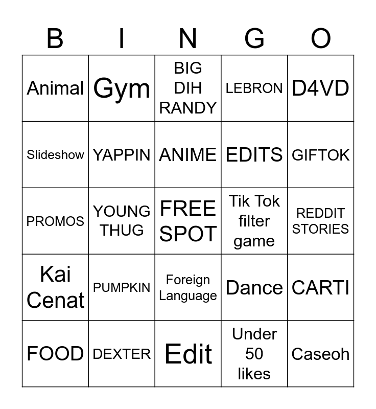 This bingo card has a free space and 24 words: PUMPKIN, DEXTER, ANIME, FOOD, D4VD, Animal, Slideshow, Gym, Tik Tok filter game, Foreign Language, EDITS, PROMOS, Dance, CARTI, YAPPIN, Under 50 likes, REDDIT STORIES, BIG DIH RANDY, GIFTOK, YOUNG THUG, Caseoh, Kai Cenat, LEBRON and Edit.