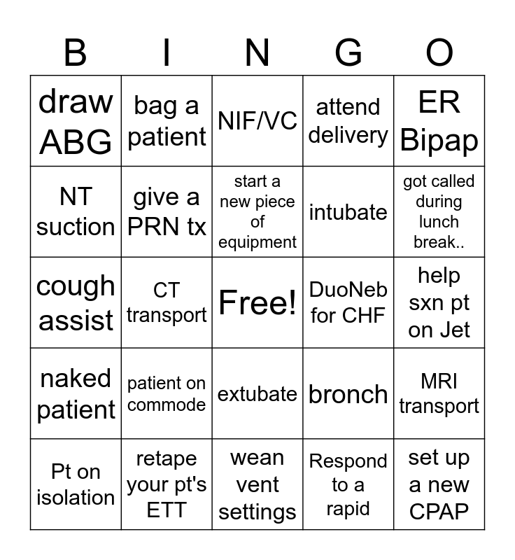 This bingo card has a free space and 24 words: patient on commode, retape your pt's ETT, start a new piece of equipment, Pt on isolation, ER Bipap, draw ABG, NT suction, bag a patient, DuoNeb for CHF, extubate, intubate, cough assist, bronch, MRI transport, give a PRN tx, Respond to a rapid, help sxn pt on Jet, NIF/VC, got called during lunch break.., CT transport, set up a new CPAP, naked patient, attend delivery and wean vent settings.
