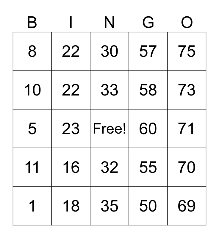 This bingo card has a free space and 24 words: 1, 16, 33, 50, 75, 8, 22, 30, 60, 71, 5, 22, 55, 70, 10, 18, 35, 57, 73, 11, 23, 32, 58 and 69.