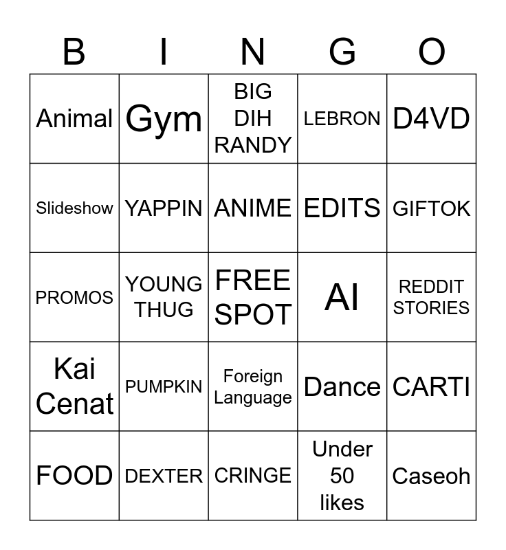 This bingo card has a free space and 24 words: PUMPKIN, DEXTER, ANIME, FOOD, D4VD, Animal, Slideshow, Gym, AI, Foreign Language, EDITS, PROMOS, Dance, CARTI, YAPPIN, Under 50 likes, REDDIT STORIES, BIG DIH RANDY, GIFTOK, YOUNG THUG, Caseoh, Kai Cenat, LEBRON and CRINGE.