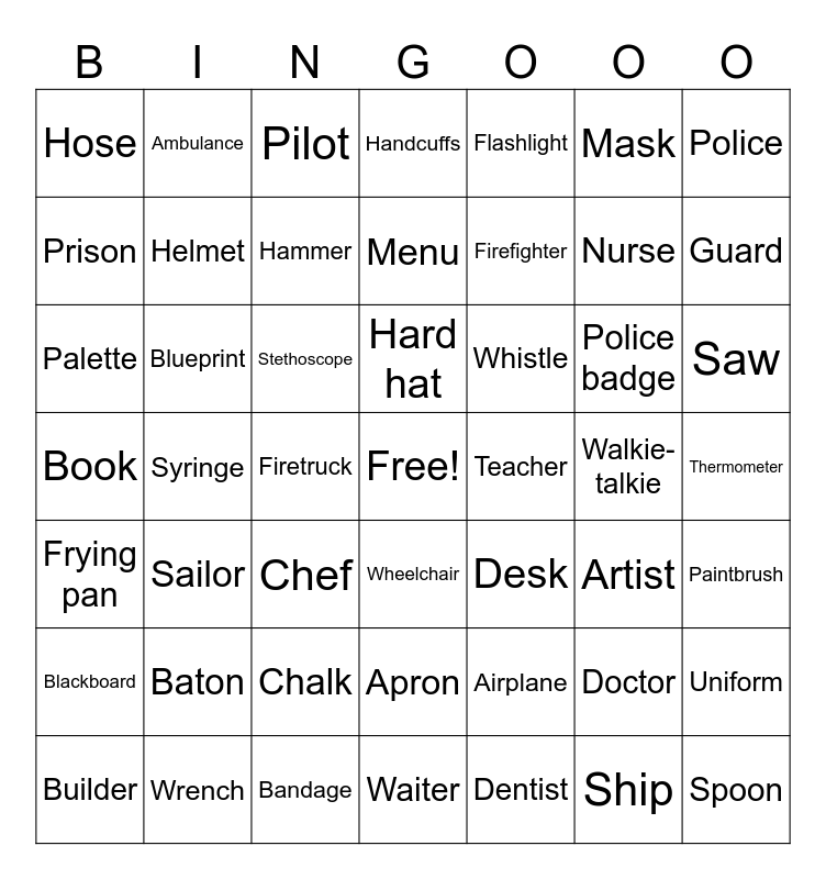 This bingo card has a free space and 49 words: Doctor, Nurse, Dentist, Syringe, Stethoscope, Thermometer, Ambulance, Bandage, Mask, Wheelchair, Police, Handcuffs, Police badge, Whistle, Baton, Walkie-talkie, Prison, Guard, Uniform, Flashlight, Firefighter, Firetruck, Hose, Helmet, Builder, Hammer, Saw, Wrench, Hard hat, Blueprint, Crane, Teacher, Blackboard, Chalk, Book, Desk, Artist, Paintbrush, Palette, Chef, Apron, Frying pan, Spoon, Waiter, Menu, Pilot, Airplane, Sailor and Ship.