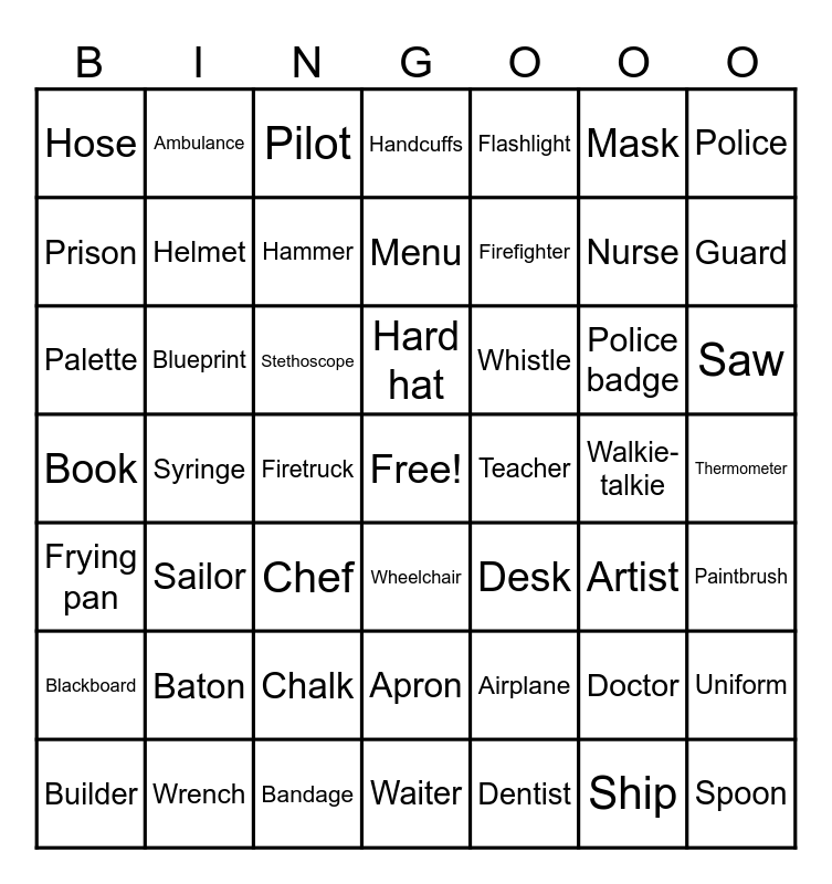 This bingo card has a free space and 49 words: Doctor, Nurse, Dentist, Syringe, Stethoscope, Thermometer, Ambulance, Bandage, Mask, Wheelchair, Police, Handcuffs, Police badge, Whistle, Baton, Walkie-talkie, Prison, Guard, Uniform, Flashlight, Firefighter, Firetruck, Hose, Helmet, Builder, Hammer, Saw, Wrench, Hard hat, Blueprint, Crane, Teacher, Blackboard, Chalk, Book, Desk, Artist, Paintbrush, Palette, Chef, Apron, Frying pan, Spoon, Waiter, Menu, Pilot, Airplane, Sailor and Ship.
