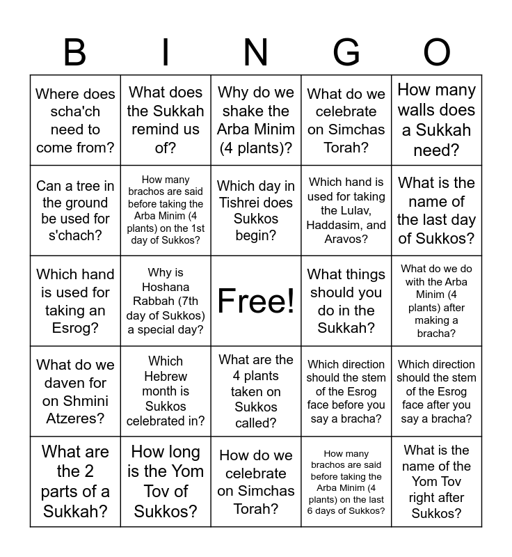 This bingo card has a free space and 24 words: Which Hebrew month is Sukkos celebrated in?, How long is the Yom Tov of Sukkos?, Which day in Tishrei does Sukkos begin?, What are the 2 parts of a Sukkah?, How many walls does a Sukkah need?, Where does scha'ch need to come from?, Can a tree in the ground be used for s'chach?, What does the Sukkah remind us of?, What things should you do in the Sukkah?, What are the 4 plants taken on Sukkos called?, Which hand is used for taking the Lulav, Haddasim, and Aravos?, Which hand is used for taking an Esrog?, Which direction should the stem of the Esrog face before you say a bracha?, Which direction should the stem of the Esrog face after you say a bracha?, How many brachos are said before taking the Arba Minim (4 plants) on the 1st day of Sukkos?, How many brachos are said before taking the Arba Minim (4 plants) on the last 6 days of Sukkos?, What do we do with the Arba Minim (4 plants) after making a bracha?, Why do we shake the Arba Minim (4 plants)?, What is the name of the last day of Sukkos?, Why is Hoshana Rabbah (7th day of Sukkos) a special day?, What is the name of the Yom Tov right after Sukkos?, What do we daven for on Shmini Atzeres?, What do we celebrate on Simchas Torah? and How do we celebrate on Simchas Torah?.
