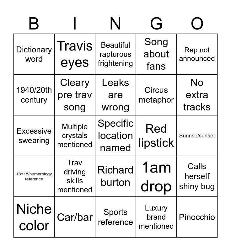 This bingo card has a free space and 24 words: Trav driving skills mentioned, Car/bar, Leaks are wrong, Niche color, Rep not announced, Dictionary word, 1940/20th century, Travis eyes, Red lipstick, Richard burton, Circus metaphor, Excessive swearing, 1am drop, Calls herself shiny bug, Cleary pre trav song, Luxury brand mentioned, Sunrise/sunset, Beautiful rapturous frightening, No extra tracks, Multiple crystals mentioned, Pinocchio, 13+18/numerology reference, Song about fans and Sports reference.
