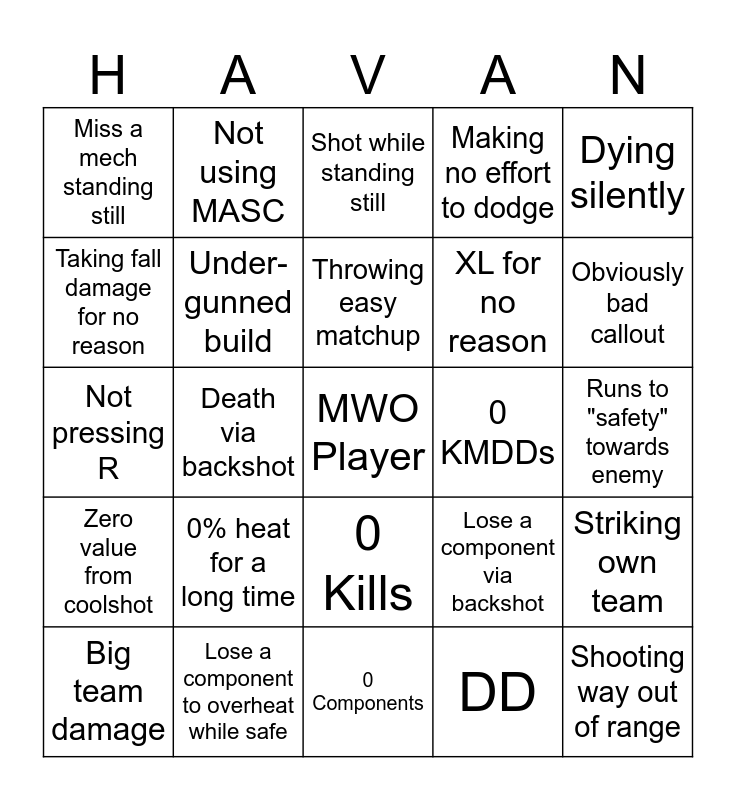 This bingo card has a free space and 30 words: Lose a component to overheat while safe, Death via overheat, Death via backshot, Runs straight away with back showing, Miss a mech standing still, Shot while standing still, Under-gunned build, 0 Kills, 0 KMDDs, 0 Components, Runs to "safety" towards enemy, Shooting way out of range, DD, Help! I've fallen and I can't get up!, Obviously bad callout, Ego peeking bad angle, Lose a component via backshot, Zero value from coolshot, 0% heat for a long time, Dying silently, Not pressing R, Not using JJs, Not using MASC, XL for no reason, Taking fall damage for no reason, Making no effort to dodge, Striking own team, Big team damage, Throwing easy matchup and Forgetting Override.
