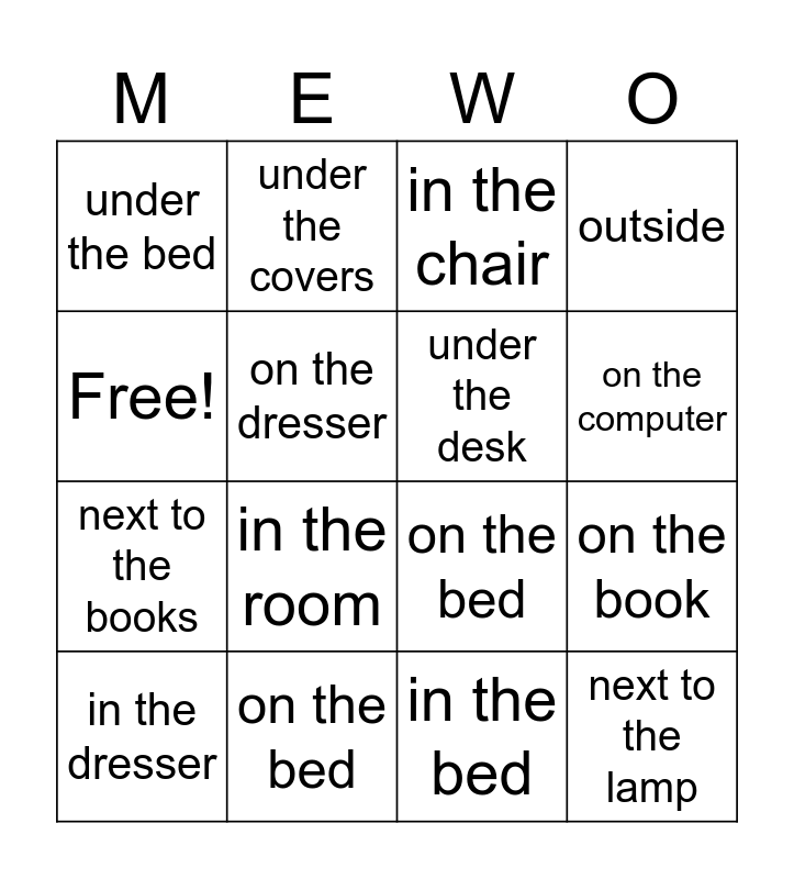 This bingo card has 16 words: on the bed, on the book, in the chair, under the bed, next to the books, under the covers, on the bed, in the bed, Free!, on the dresser, in the dresser, outside, in the room, on the computer, under the desk and next to the lamp.