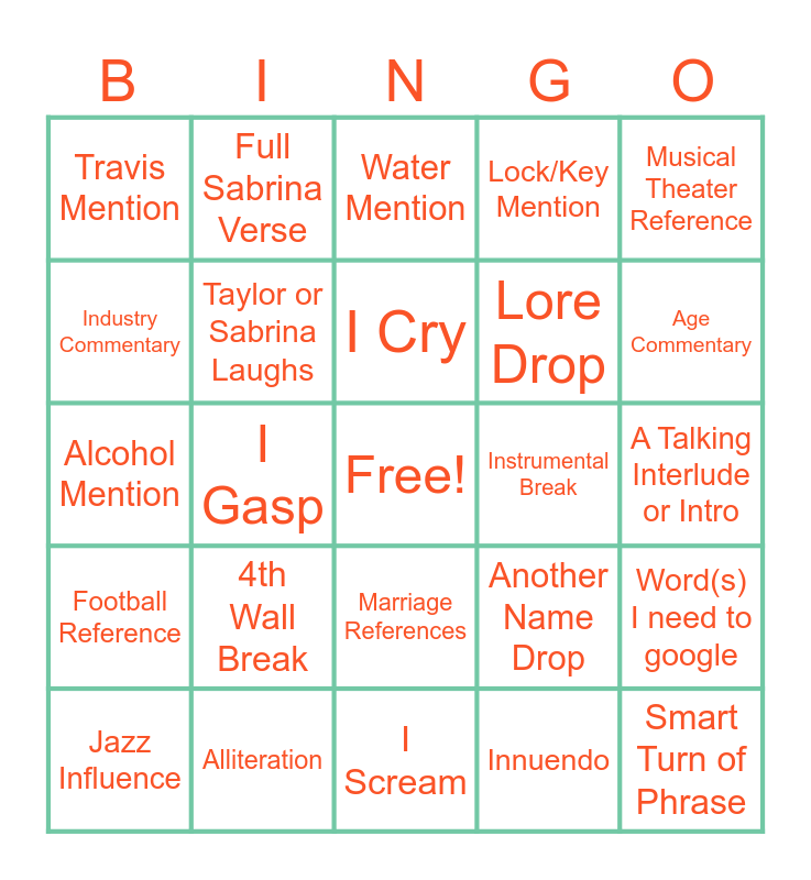This bingo card has a free space and 24 words: 4th Wall Break, Alliteration, I Cry, Jazz Influence, Musical Theater Reference, Travis Mention, Industry Commentary, Full Sabrina Verse, Instrumental Break, Marriage References, Lore Drop, Alcohol Mention, Another Name Drop, Word(s) I need to google, Taylor or Sabrina Laughs, Innuendo, A Talking Interlude or Intro, Water Mention, Age Commentary, I Gasp, Smart Turn of Phrase, Football Reference, Lock/Key Mention and I Scream.