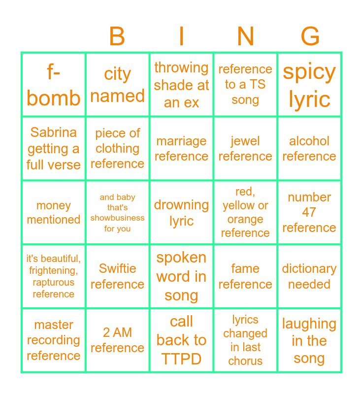 This bingo card has a free space and 48 words: midnight reference, 2 AM reference, car reference, football reference, alcohol reference, drug reference, city named, city/ town metaphor, red, yellow or orange reference, any other colour mentioned, Sabrina getting a full verse, piece of clothing reference, female rage, dictionary needed, Eras Tour mentioned, religious metaphor, throwing shade at an ex, fame reference, Shakespeare retellling, f-bomb, Swiftie reference, call back to TTPD, reference to a TS song, spicy lyric, witchy lyric, and baby that's showbusiness for you, marriage reference, rollercoaster reference, number 47 reference, it's beautiful, frightening, rapturous reference, sparkling, bedazzling, bejewelled reference, youth or aging reference, murder reference, depression reference, master recording reference, Snake Gate reference, the prophecy reference, lyrics changed in last chorus, laughing in the song, I cry, Pinocchio reference, spoken word in song, jewel reference, perfume reference, money mentioned, glitter mentioned, Travis mentioned and at least 5 names mentioned.