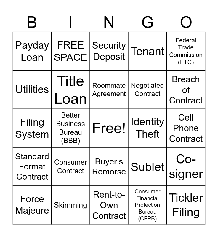This bingo card has a free space and 25 words: Consumer Contract, Rent-to-Own Contract, Roommate Agreement, Force Majeure, Federal Trade Commission (FTC), Payday Loan, Utilities, FREE SPACE, Identity Theft, Buyer’s Remorse, Negotiated Contract, Filing System, Sublet, Co-signer, Title Loan, Consumer Product Safety Commission (CPSC), Cell Phone Contract, Security Deposit, Breach of Contract, Better Business Bureau (BBB), Tickler Filing, Skimming, Standard Format Contract, Tenant and Consumer Financial Protection Bureau (CFPB).