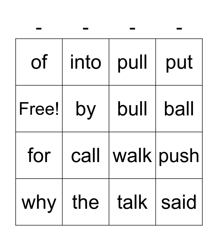 This bingo card has 16 words: the, push, pull, of, for, into, walk, talk, Free!, by, why, put, call, ball, bull and said.